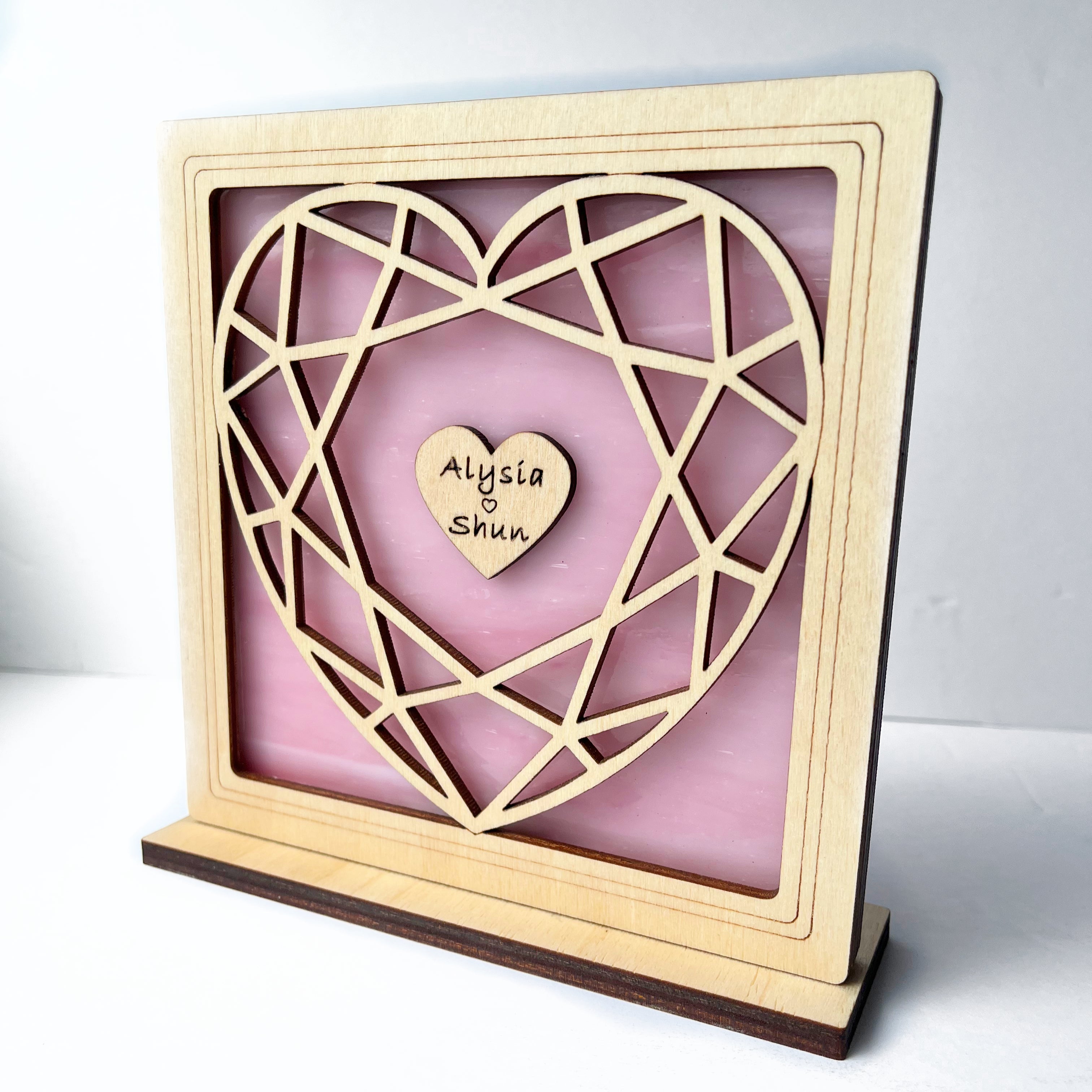 The small floating heart in the center can be customized with a name or date (or both). This design makes for a wonderful gift, keepsake or centerpiece.